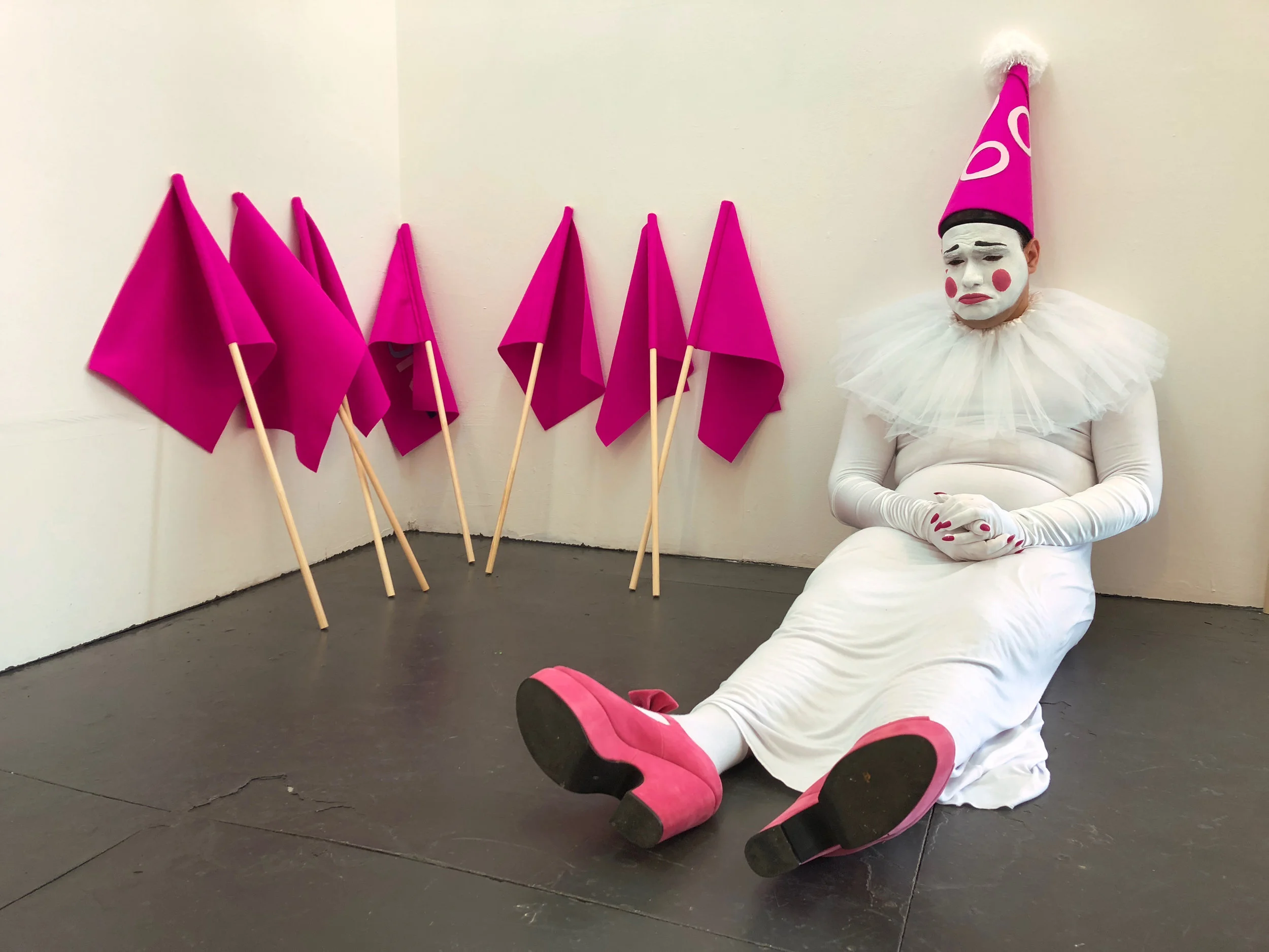 Outcast is a participatory installation devised as one of the backdrops for ‘Will you be mime?’, which uses signs associated with moments of protest and celebration which bring communities together in public spaces: Flags and Bunting. The two objects are featured in Pride Parades, as well as carnivals and fairs. These signs unify the three prominent areas of my artistic research: participation, theatre and queer culture.